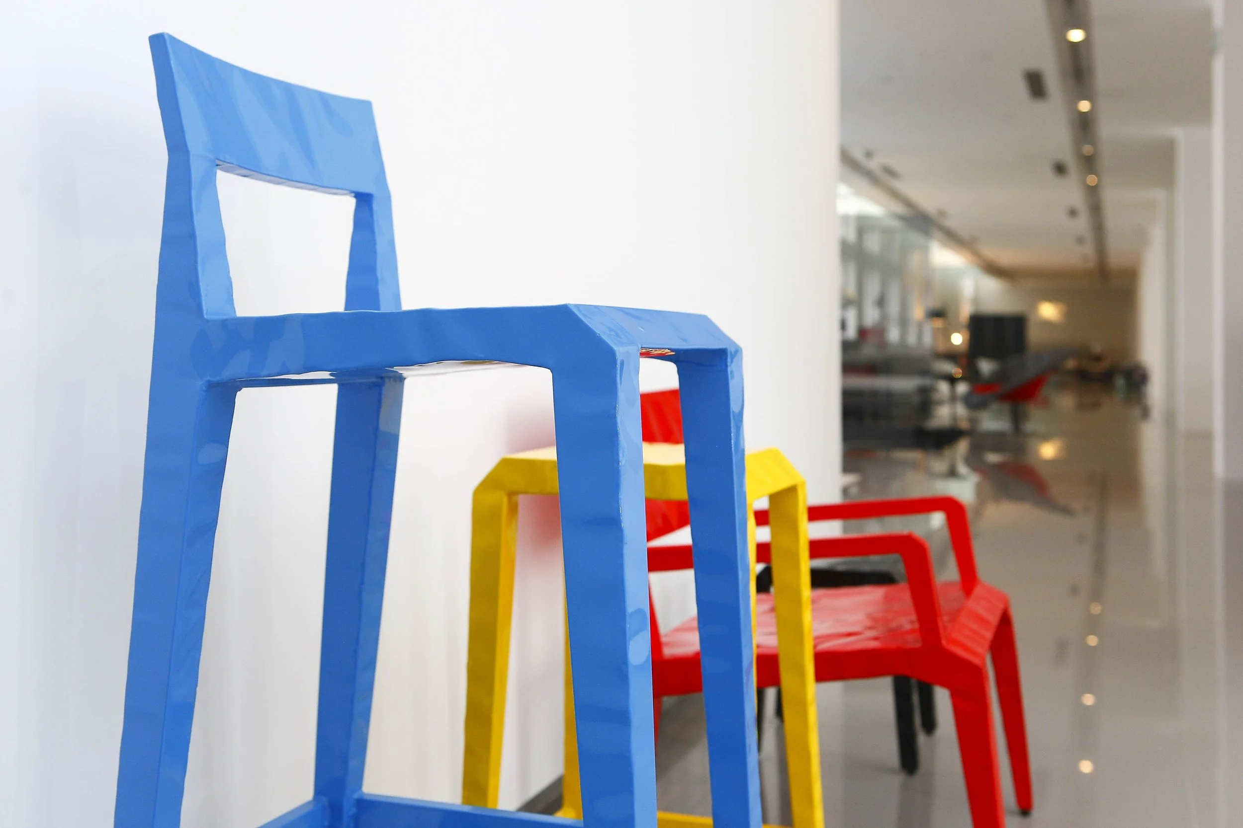 Modern living room with two white curved armchairs, small black ottomans, a patterned area rug, a tall silver floor lamp, a small side table, and a wall-mounted blue geometric art piece.